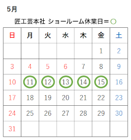 View Larger Image 5月営業日のご案内【匠工芸 本社】 本社ショールームの営業日は、上記カレンダーの通りとなります。 営業時間:午前10時~午後5時まで 5/11(月)~5/15(金)は、イベント準備のためお休みをいただきます。 皆様のご来場をお待ちしております。 ご不明点等ございましたら下記フォームまでお問い合わせください。 お問い合わせフォーム https://takumikohgei.com/contact/ takumikohgei-user2026-04-21T18:58:40+09:002026.04.21|News, 営業日案内|